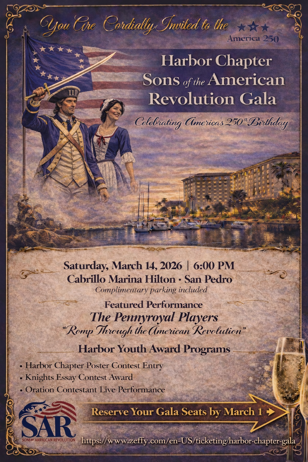 We hope you will join us for a gracious and unforgettable evening set against the shimmering waters of San Pedro Harbor, where harbor lights and open skies provide a fitting backdrop for reflection and celebration. Gather with friends and fellow patriots as we honor our shared history, celebrate our accomplishments, and come together in the spirit of America 250.March 14, 6-9 PM 2800 Via Cabrillo-Marina San Pedro, CA https://www.zeffy.com/en-US/ticketing/harbor-chapter-gala